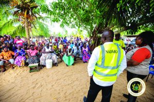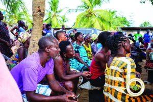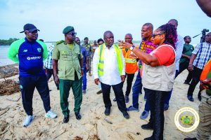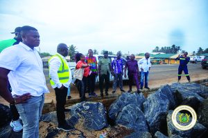 The minister was received on the ground by the Anloga District Chief Executive, Sandra Seyram Kpedor, and her team. Residents and local leaders briefed the delegation on the scale of the devastation, explaining that the community of Kporkporgbor had been completely cut off, while Fuveme itself was washed away years ago, forcing many residents to relocate to Agorkedzi.