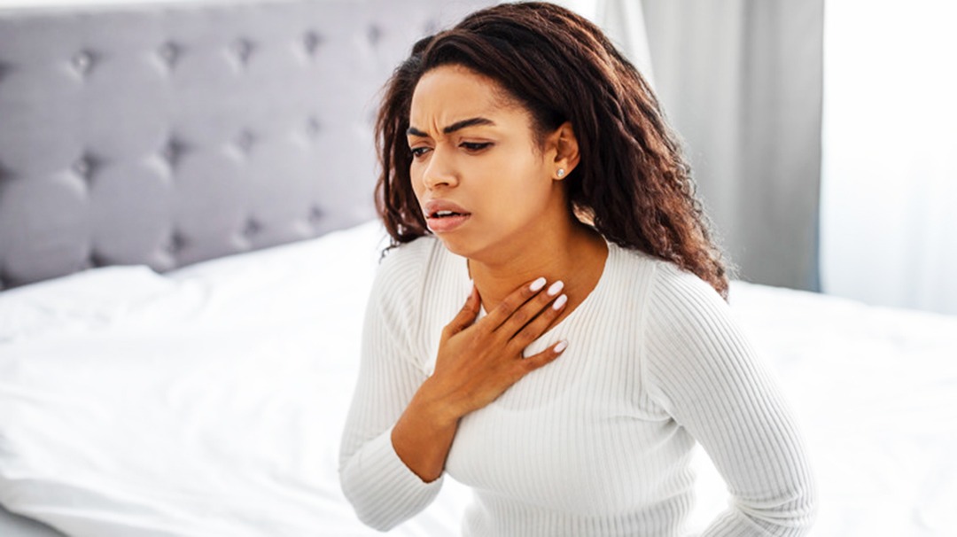 Acid reflux. This is a digestive disorder that happens when your stomach acid comes back up your esophagus into your throat. The medical term for it is gastroesophageal reflux disease (GERD). Other symptoms can include heartburn, a hoarse voice, or a sore throat that feels lumpy when you wake up in the morning.